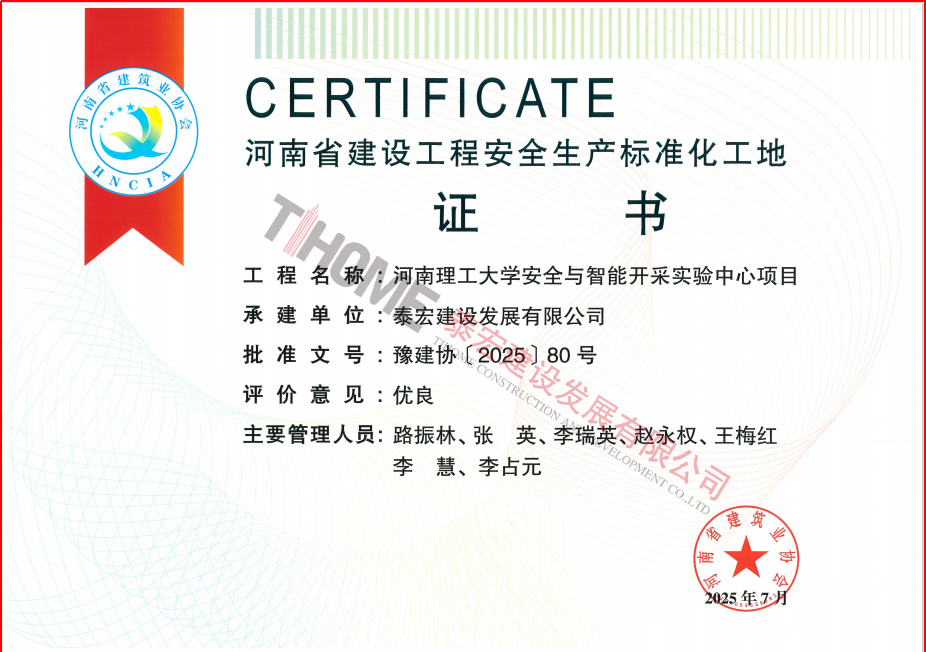 近日,河南省建筑业协会公布了“2025年度第一批河南省建设工程安全生产标准化工地”名单,泰宏建设承建的信阳市第四人民医院感染区建设及病房楼改造、河南理工大学安全与智能开采实验中心两项目荣获此项殊荣,评价结果均为优良。